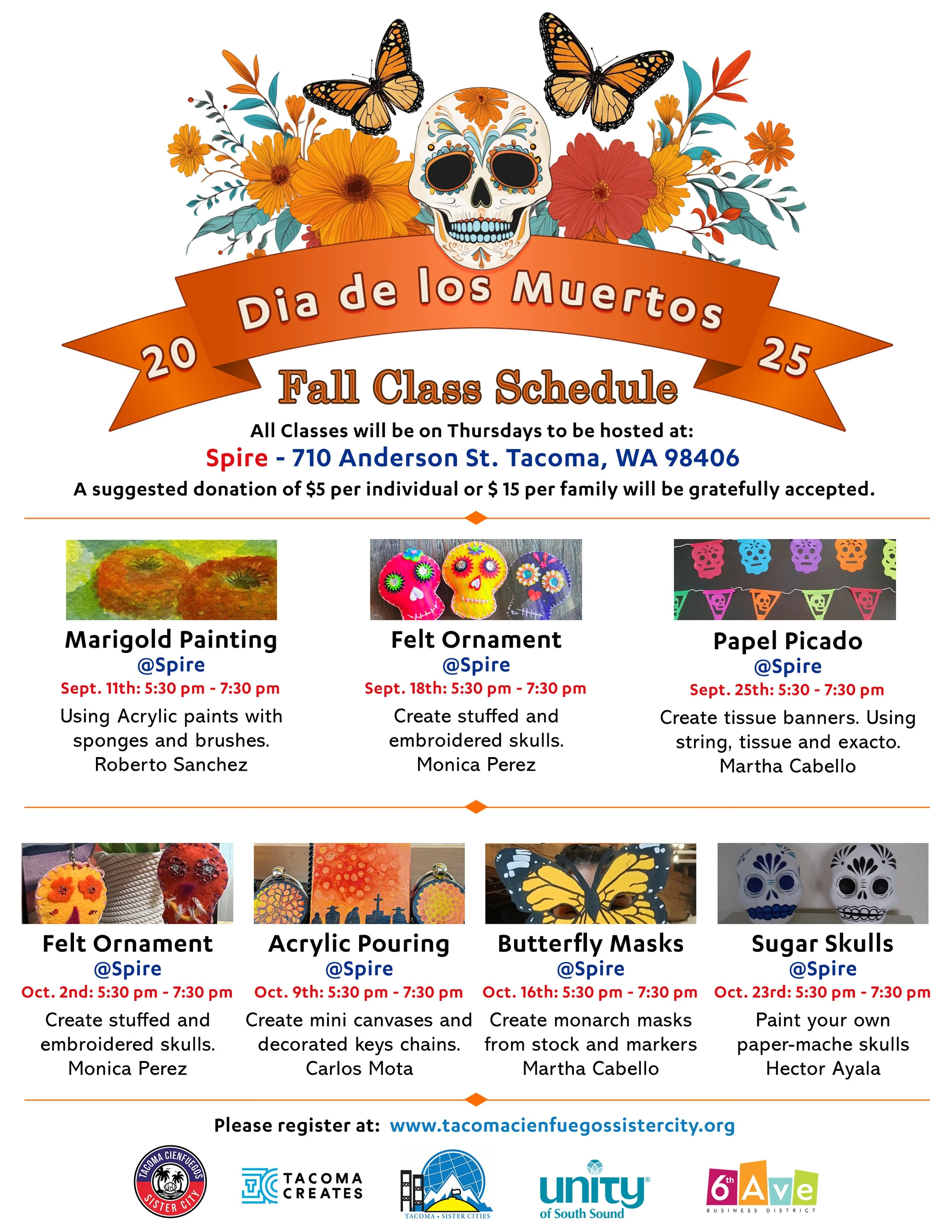 Interested in taking some fun classes leading up to our Day of the Dead event. All classes will be held at Spire, located at 710 Anderson St., Tacoma, WA 98406. A suggested donation of $5 per individual or $ 15 per family will be gratefully accepted.