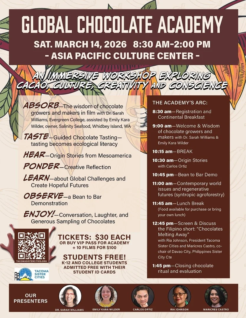 12:45pm - Screen & Discuss the Filipino short: "Chocolates Melting Away" with Ria Johnson, President of Tacoma Sister Cities and Maricres Castro, Co-Chair of Davao City, Philippines Sister City